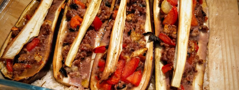 Dans un saladier, mélanger les 2 viandes, la pulpe du citron et la tomate coupées finement, la coriandre ciselée (en mettre beaucoup) et 1 cuillère à soupe d’huile d’olive. Laver et couper les aubergines en 2, dans le sens de la longueur. Récupérer la chair : en mettre 1/3 dans la farce, réserver le reste. Dans un plat allant au four, verser les 2 cuillères à soupe d’huile puis le riz, ajouter de l’eau jusqu’à 5mm au dessus du niveau du riz. Disposer les aubergines évidées et les remplir de farce. Cuire 40 minutes à 200°C.