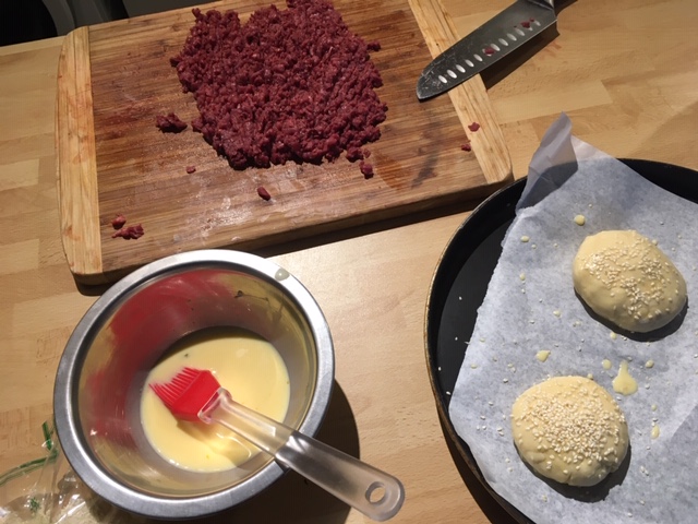 Mélangez la levure dans le lait tiède. Dans un saladier, mélangez la farine, le sel et 2g sucre. Puis ajoutez le lait contenant la levure. Ajoutez le beurre mou. Pétrissez jusqu’à ce que la pâte forme une boule. Coupez la pâte en 2 pâtons équivalents. Laissez reposer 1h à température ambiante. Dorez les pâtons avec du jaune d’oeuf mélangé à un peu de lait. Saupoudrez le sésame. Enfournez pour 20 minutes à 180°C.
