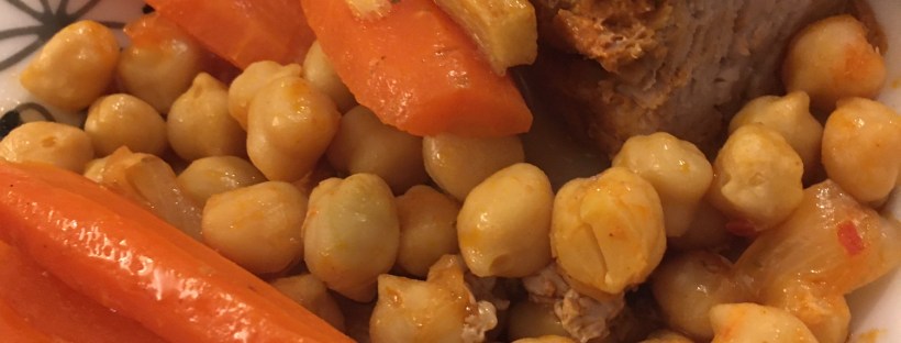 Peler et laver les carottes. Les couper en gros bâtonnets. Peler et émincer l’oignon. Peler l’ail. Egoutter les pois chiche. Dans une sauteuse chaude, verser 2 cuillères à soupe d’huile, ajouter les épices puis faire revenir le filet mignon pour dorer rapidement toutes les faces. Dans une poêle chaude, verser 2 cuillères à soupe d’huile, faire revenir l’oignon émincé et cuire les carottes 5 minutes à l’étouffée (elles restent croquantes).