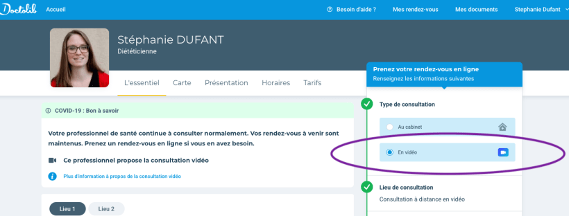 - Sélectionnez consultation « en vidéo » lors de la prise de rendez-vous sur Doctolib