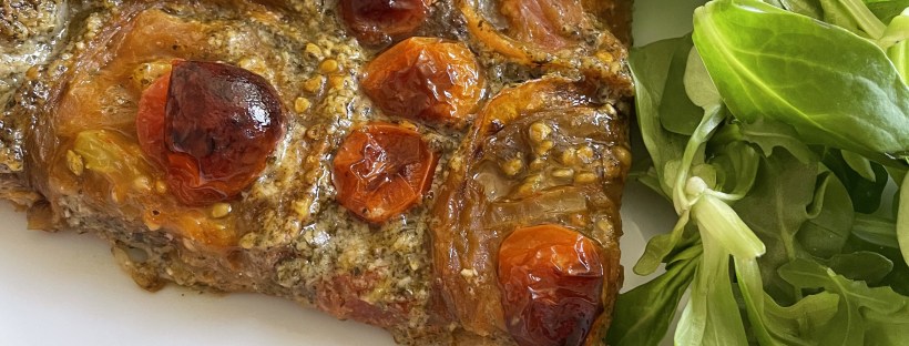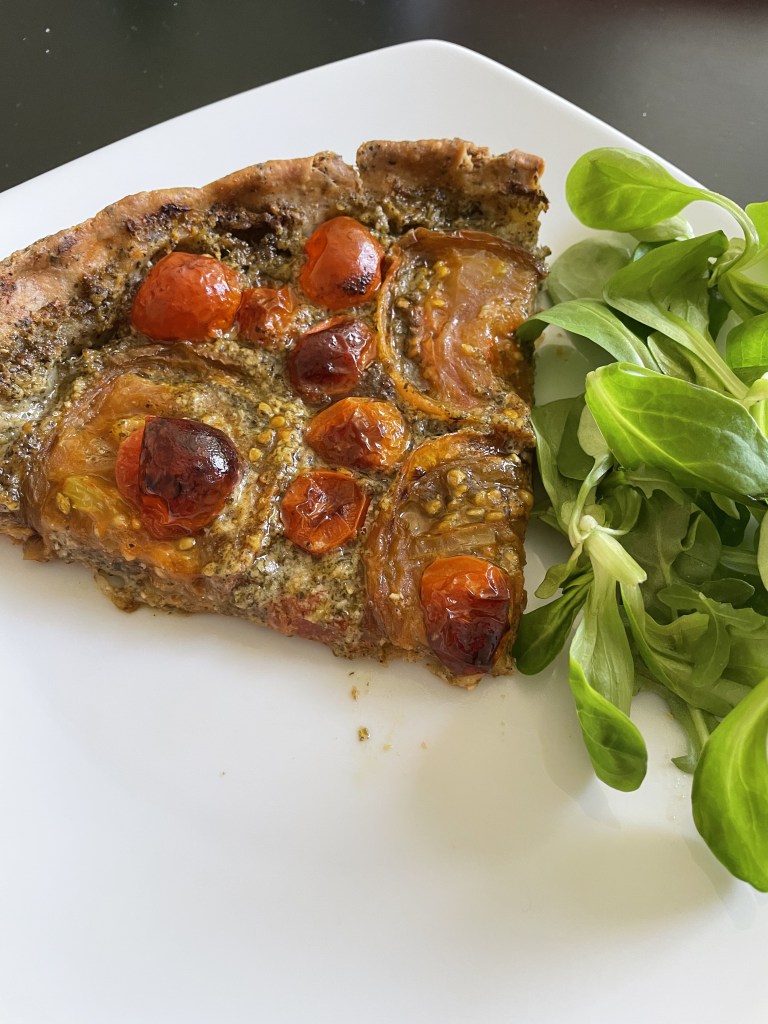 - Procéder au montage. Etaler la pâte dans un plat à tarte, étaler le pesto puis disposer une épaisseur de tomate (la grosse tomate sera tranchée en lamelles de 5mm d’épaisseur et les tomates cerises seront coupées en 2).