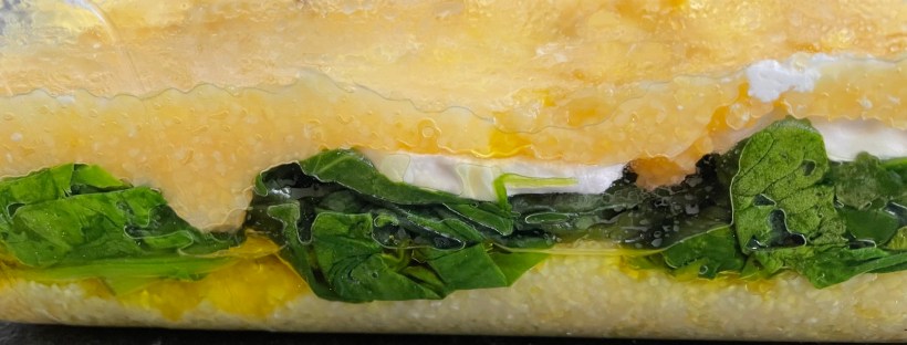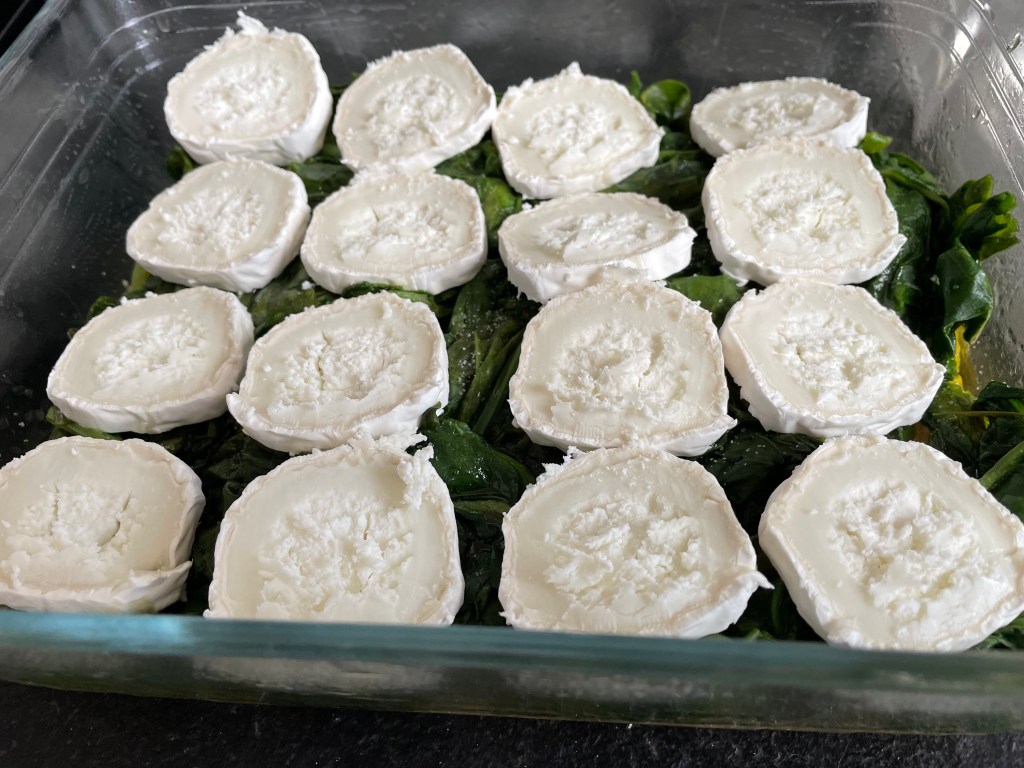 Répartir l’huile au pinceau dans le fond d’un plat à gratin. Déposer la moitié de la polenta puis les épinards puis la bûche de chèvre coupée en tranches et finir par le reste de polenta.