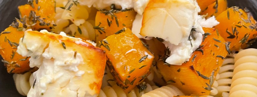 Peler et couper la butternut en cubes de 1cm. Dans un saladier, mélanger les cubes de butternut, l’huile d’olive, l’ail, le thym et le sirop d’érable. Remuer. Préchauffer le four à 200°C. Répartir les cubes de butternut assaisonnés sur une plaque de cuisson. Placer au centre le bloc de feta. Enfourner pour 25 minutes à 200°C. Pendant ce temps-là : cuire les pâtes complètes.