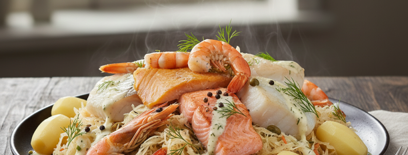 Dresser les assiettes avec la choucroute, les pommes de terre sur le côté, les poissons et crustacés sur le dessus et verser un peu du mélange crème-vin blanc. Déguster !